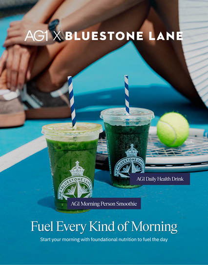 Bluestone Lane has partnered with AG1 to launch two new limited-time drinks: the AG1 Daily Health Drink and the AG1 Morning Person Smoothie. Each blend combines great taste with daily nutrition, packing your multivitamin, pre- and probiotics, superfoods, and antioxidants into one simple, delicious drink.