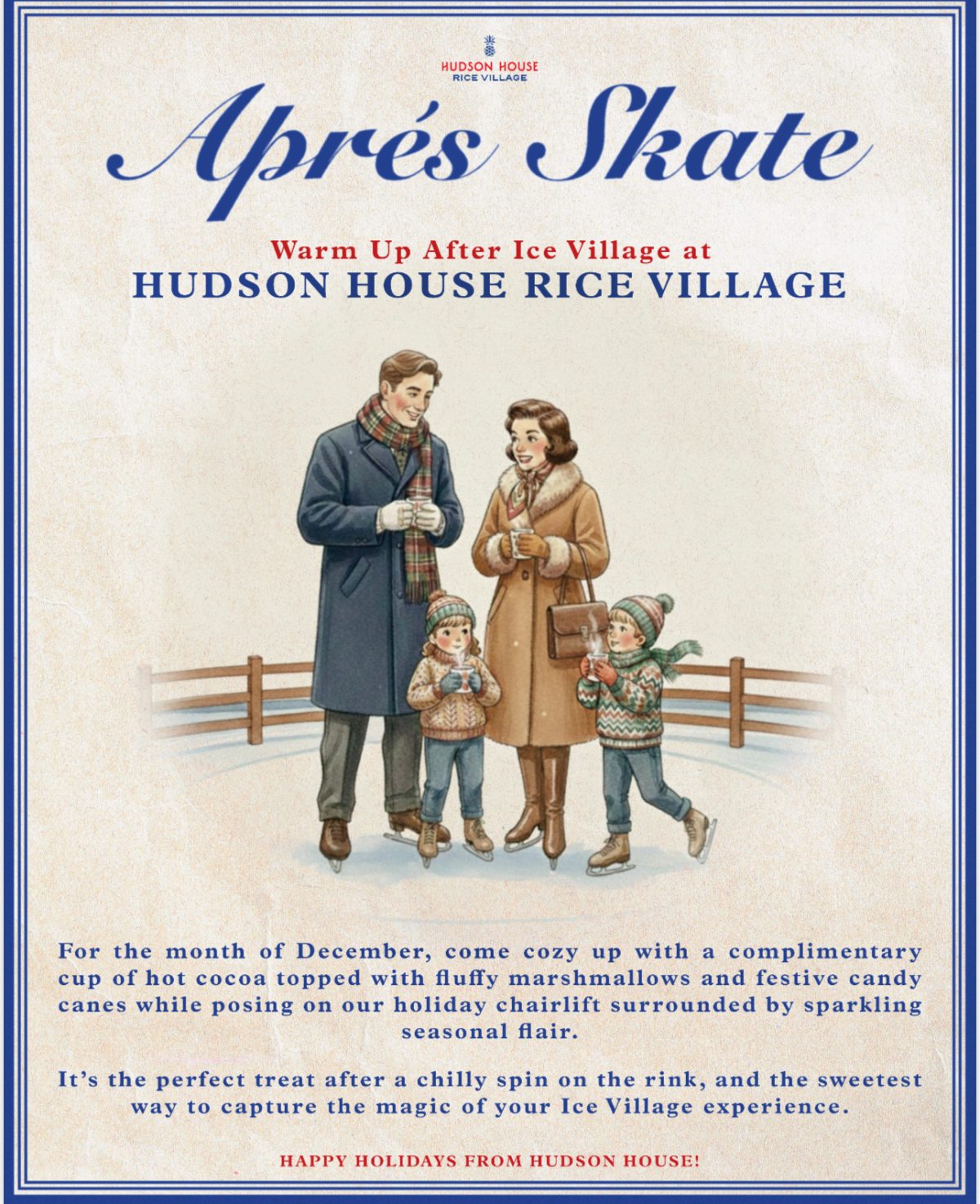 For the month of December swing by Hudson House to enjoy a complimentary cup of hot cocoa topped with fluffy marshmallows and festive candy canes while posing at their holiday chairlift surrounded by sparkling seasonal flair!