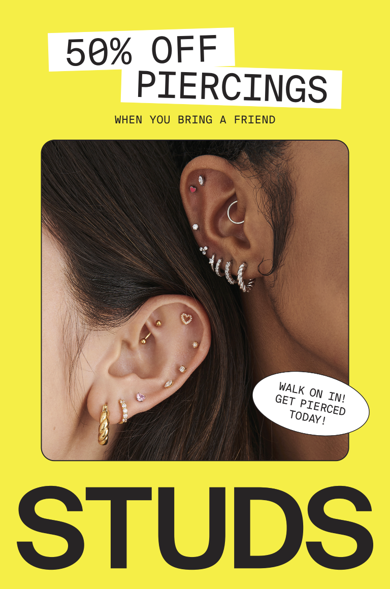 At Studs, BESTIEBOGO offers a pair of guests (individual guests are not eligible) 50% off of their Piercing Service Fee! This promotion discounts the piercing service fee. It does not discount the cost of jewelry nor applies to singular guests.