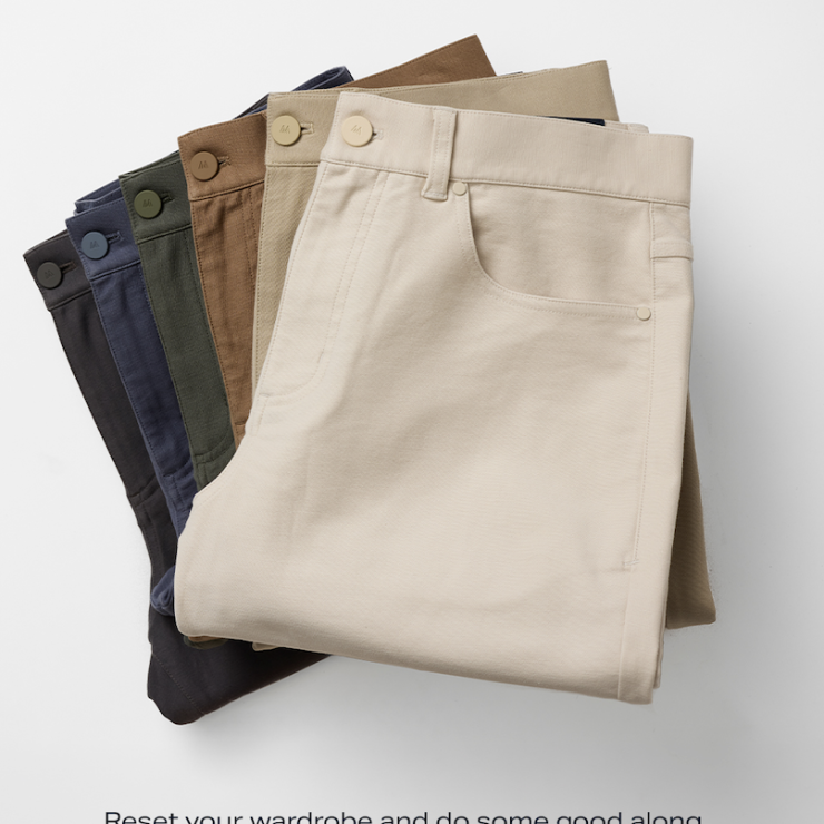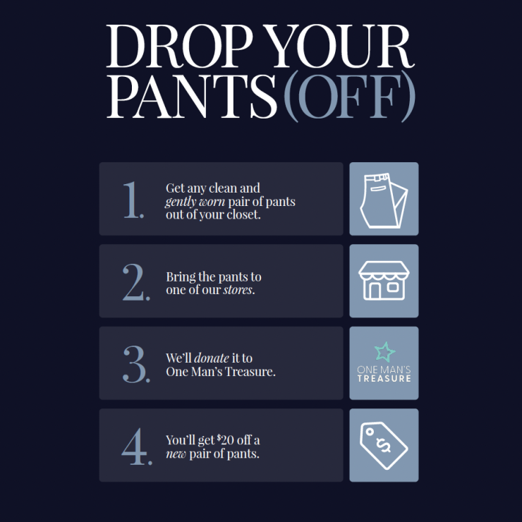 Now through March 31st, Mizzen+Main is hosting a clothing drive in partnership with the organization, One Man’s Treasure. During this time, customers can drop off any brand of clean and gently worn pants at a store location and receive $20 off for each pair donated. All pants will be donated to One Man’s Treasure at the conclusion of the drive.