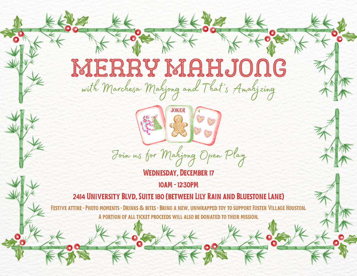 Marchesa Mahjong and Thats Amahjzing are hosting a festive morning of tiles and tidings at Rice Village. Enjoy open play, holiday photo moments, drinks, light bites, and a community toy donation for Foster Village Houston. Bring your 2025 card and get ready for a joyful Mahjong morning at Rice Village.