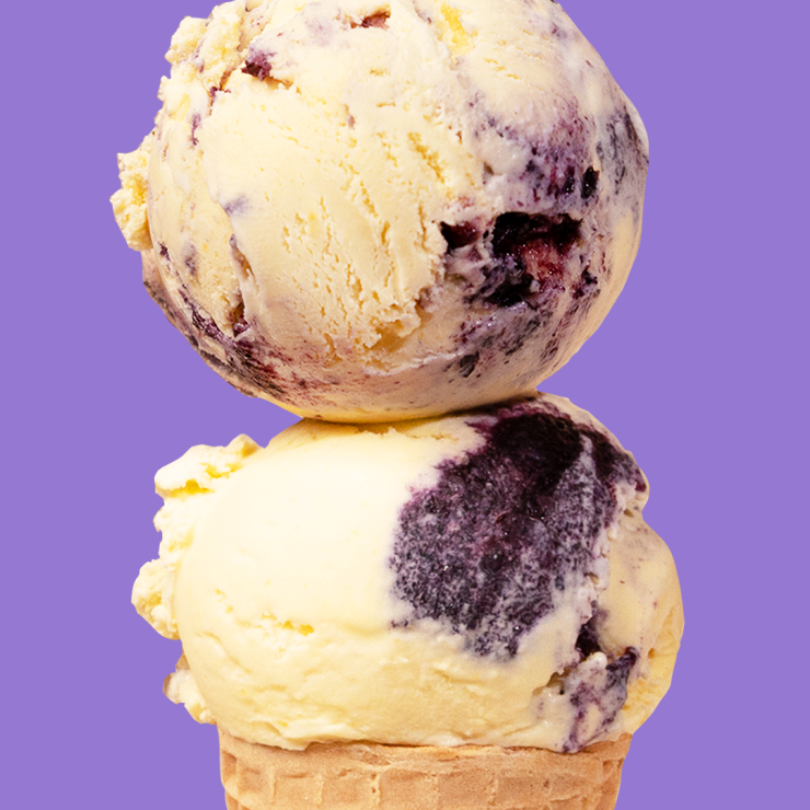 Sweet Corn & Blueberry Jam – Golden jubilee corn grown in Oregon’s Willamette Valley blended into our ice cream before churning. Blueberry compote, made with fresh whole blueberries, is then swirled into the corn ice cream.