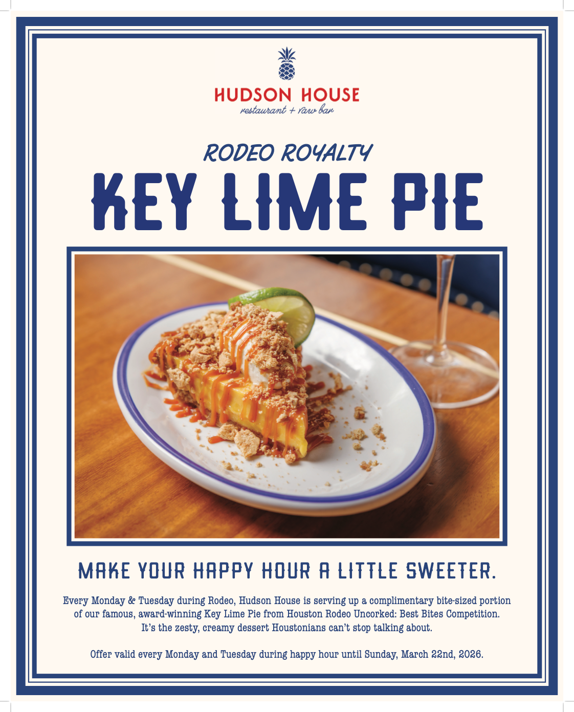 This ain’t our first rodeo, so two-step into Hudson House and enjoy a complimentary bite-sized portion of our award-winning Key Lime Pie from Houston Rodeo Uncorked! Roundup & Best Bites Competition. Every Monday & Tuesday throughout Rodeo, make your Happy Hour a […]